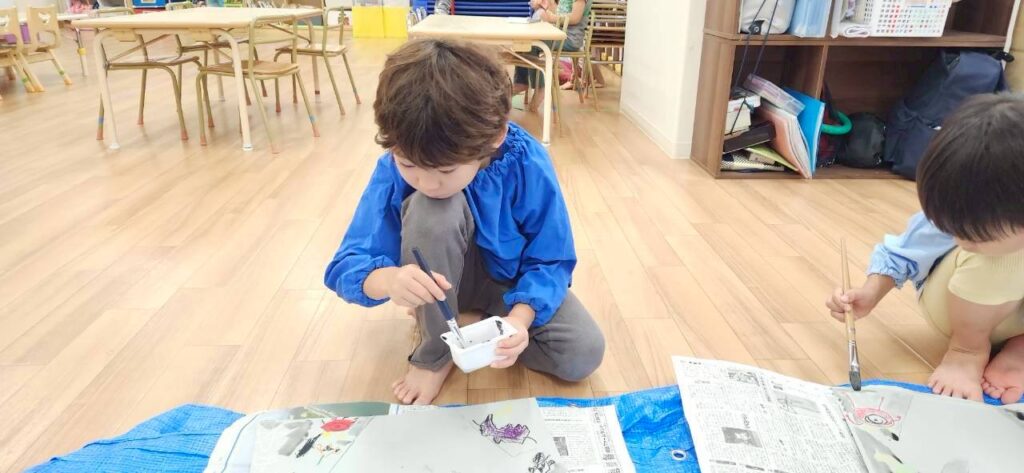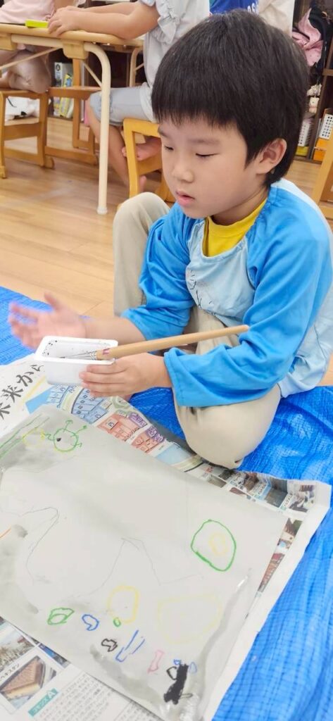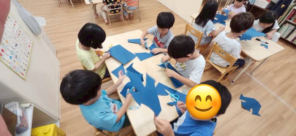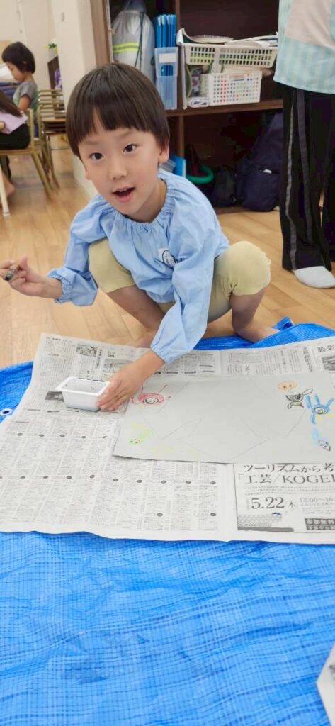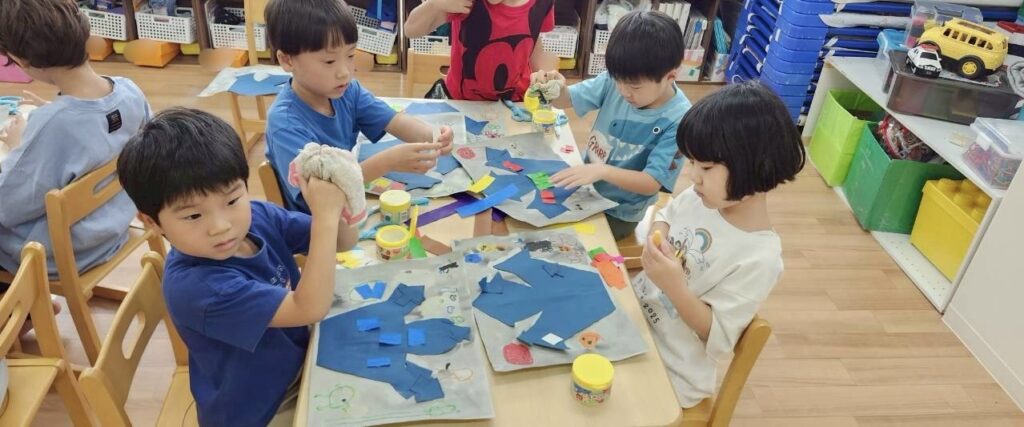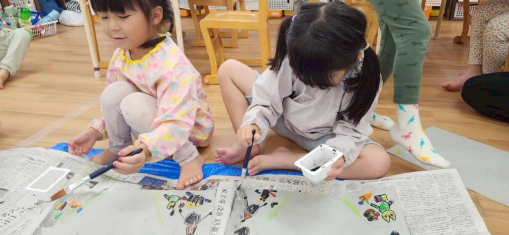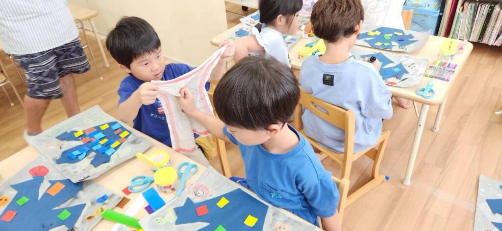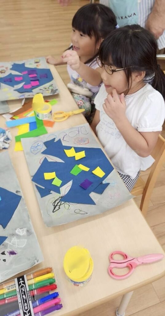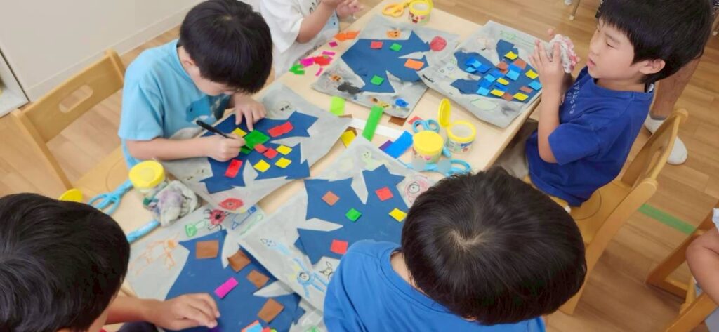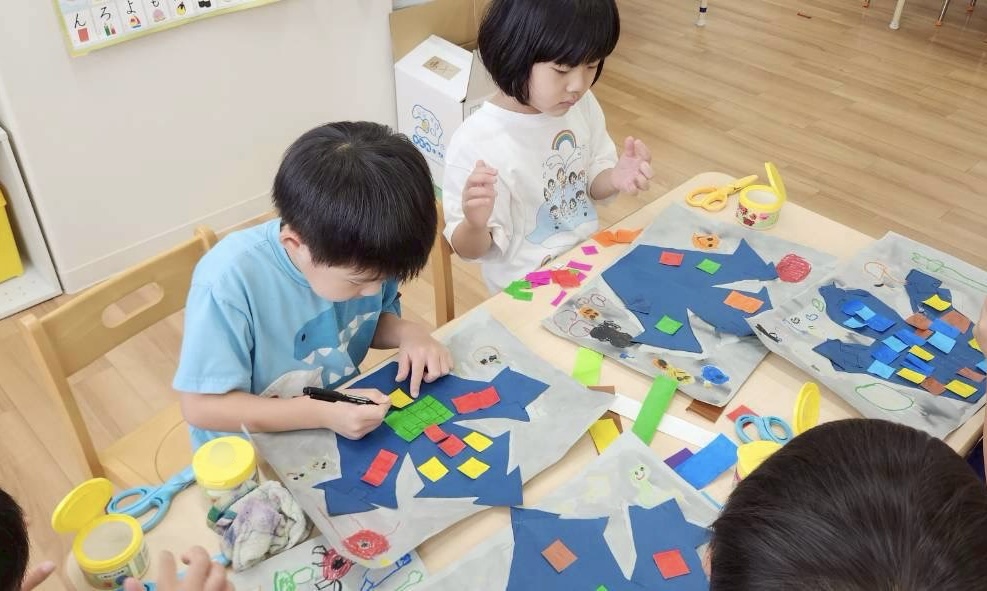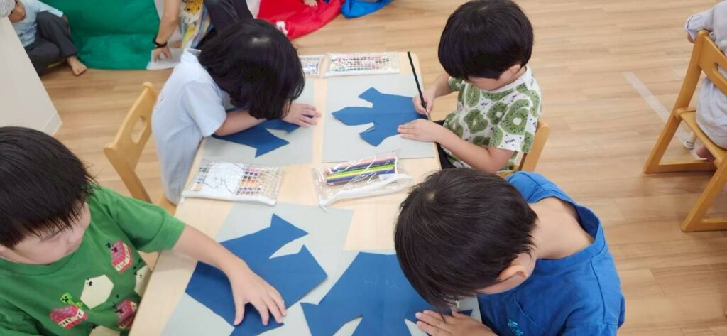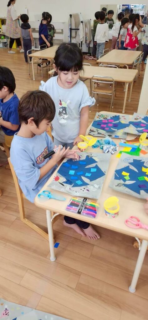 ハサミ、のり、クレヨン、絵の具…複雑な過程を経て完成させていきます。