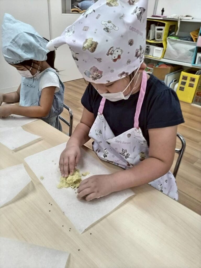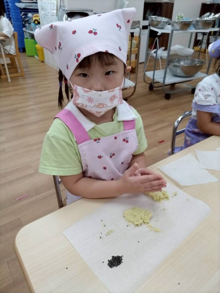 スイートポテトの形を作り、最後にゴマを振りかけます。