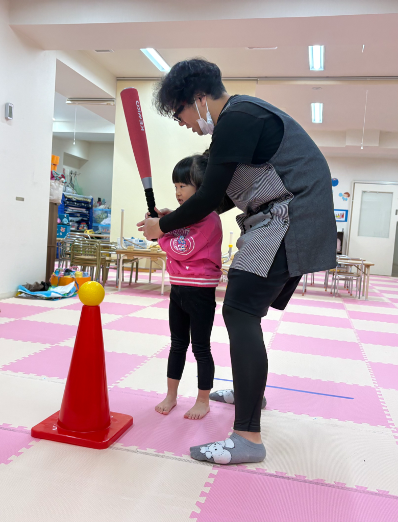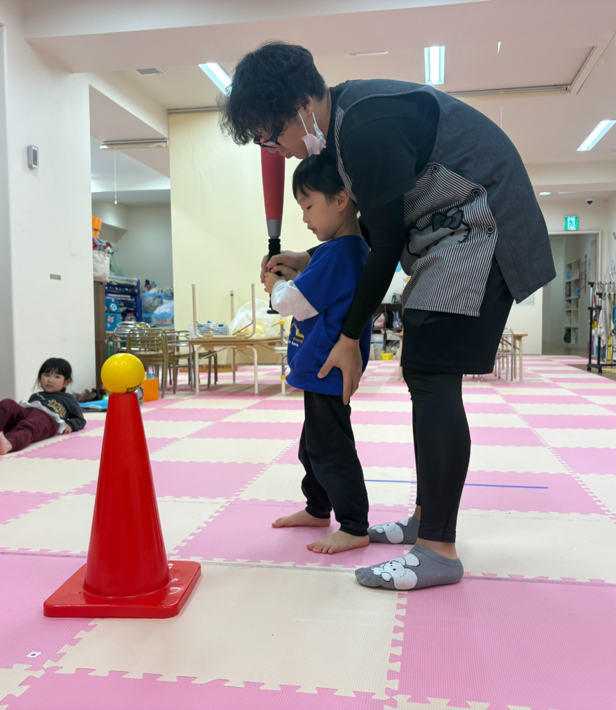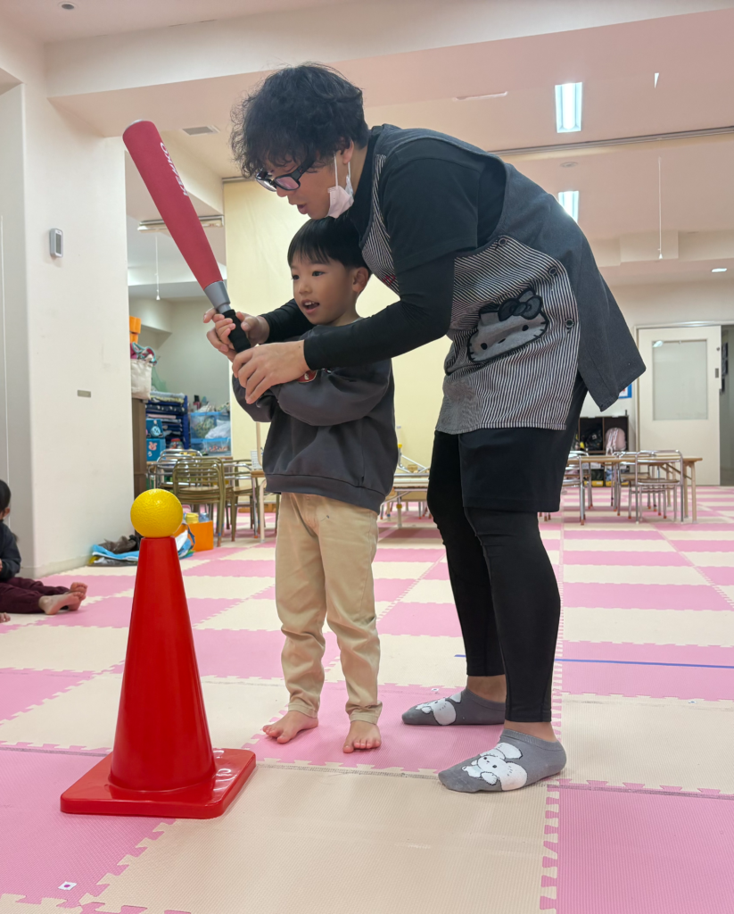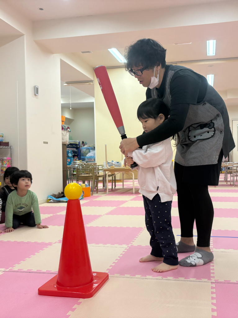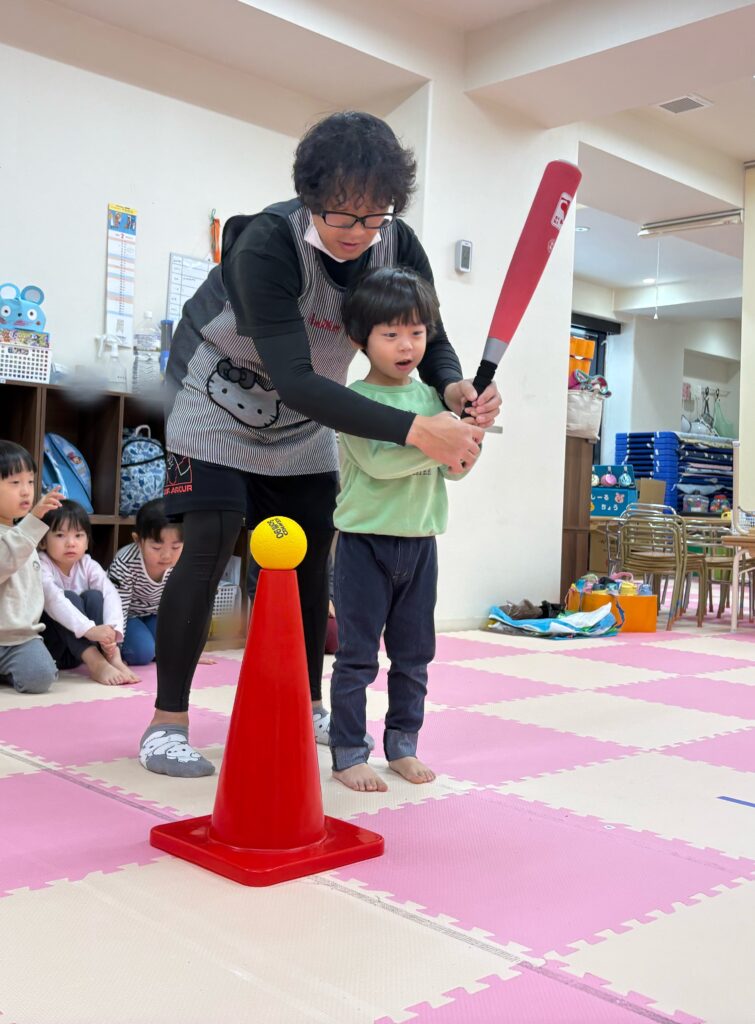 その時にバットやボールをいただいたので、3歳児クラスのお友だちも挑戦です✨